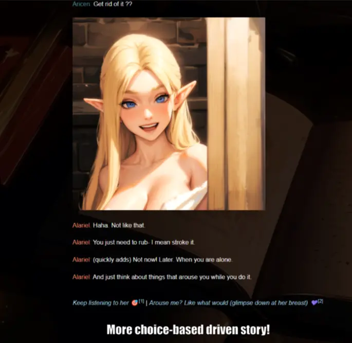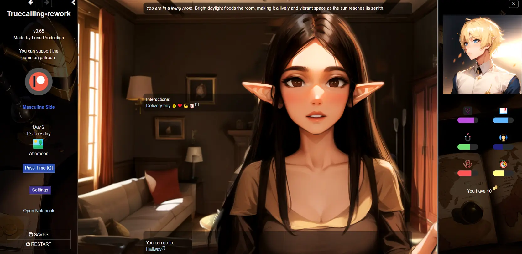 Truecalling is a medieval fantasy game. You play as male elf character who tries to survive in the capital city called Klimmore. Will you survive the harsh world and help your family rise against the corruption or will you succumb to the harsh reality of this world? The game offers six distinct routes: Alpha Route , Vanilla Route , Feminine Route , Submission Route, NTR route, Netori route . Each route features unique scenes.​