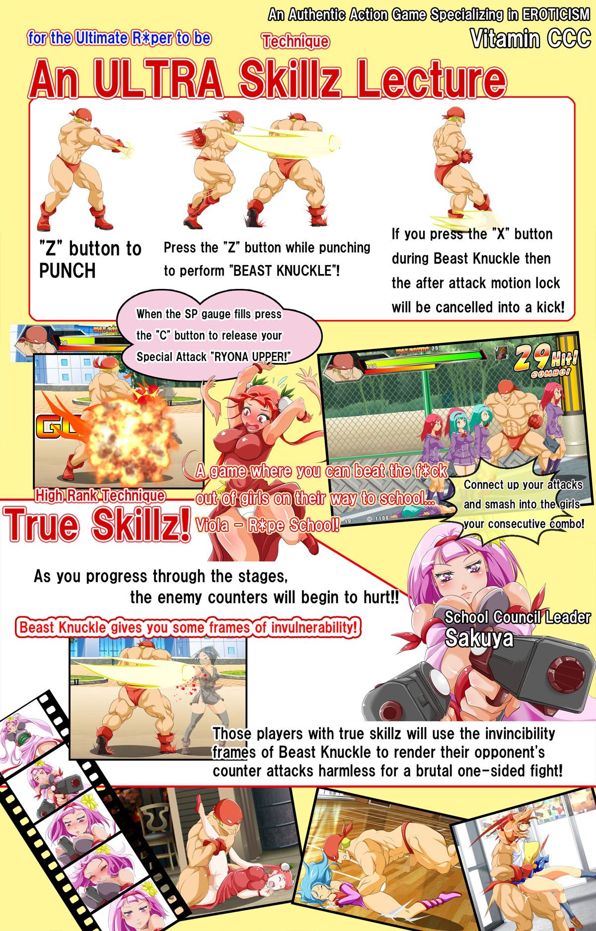 An action game with fully hand drawn animations delivered to you by Vitamin CCC. Fist fight your way into an all girls academy and leave a trail of r*pe in your wake. After downing a girl, you can control the stage procedure of r*pe at your will. This is the key point of this work! Beat the f*ck out of, capture and then have your way with the girl. Watch her as she begs for mercy or ravage her silly in one fell swoop. You can change sex positions by key command! Feel the reality, enjoy the ambiance, immerse yourself in this r*petastic work.​