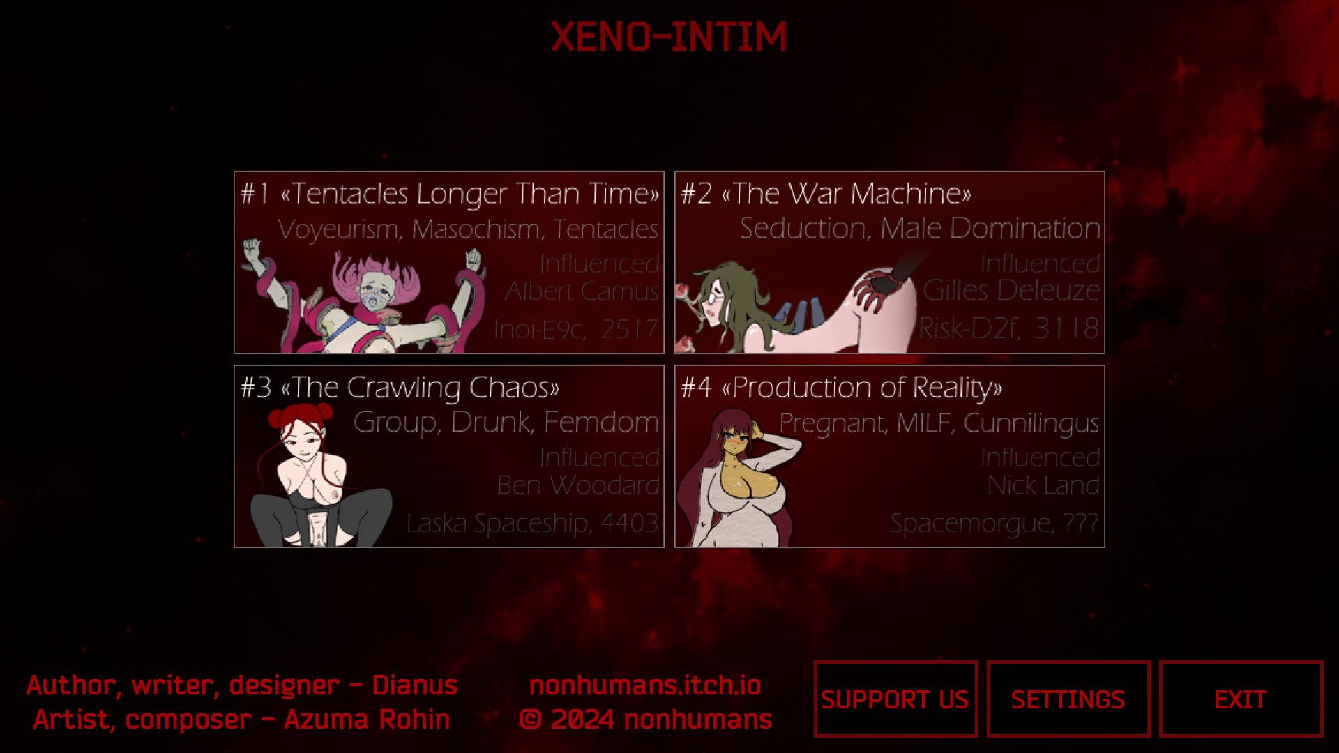 Copyright and Terms: Lewdzone is a crawling site. We post games like XENO-INTIM from trusted sources like Patreon official release, creator's official site and F95. We only share links of files provided by those sources. We do not include/exclude anything to/from the packages. We do not host those files and those files are hosted in public file sharing server and by the ToS of those servers, it is legal to share any public files. For example, sharing files publicly in mega.co.nz allows us to crawl the files. If you are the creator of XENO-INTIM then please claim copyright to those file sharing service's official DMCA form. And if you are a visitor and worrying about malwares, do not worry, we do not inject anything. Have fun.
