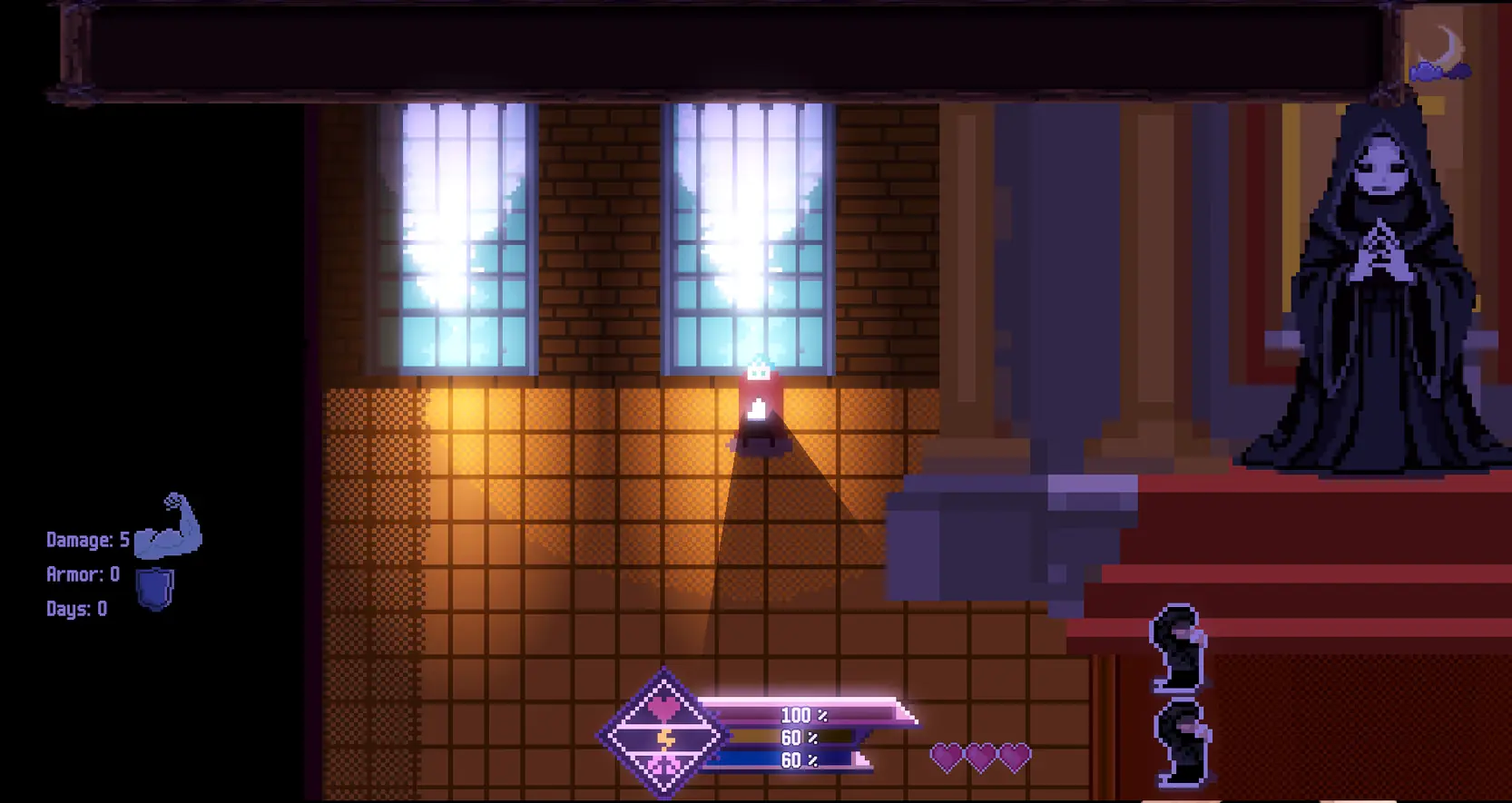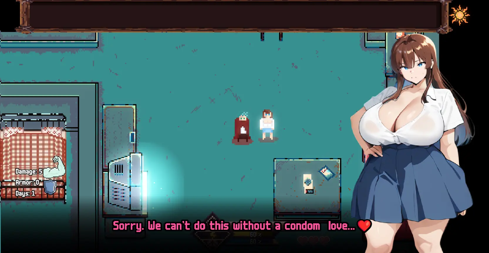 The game is a mix between a visual novel and a roguelike. It contains explicit 18+ content, NTR.
