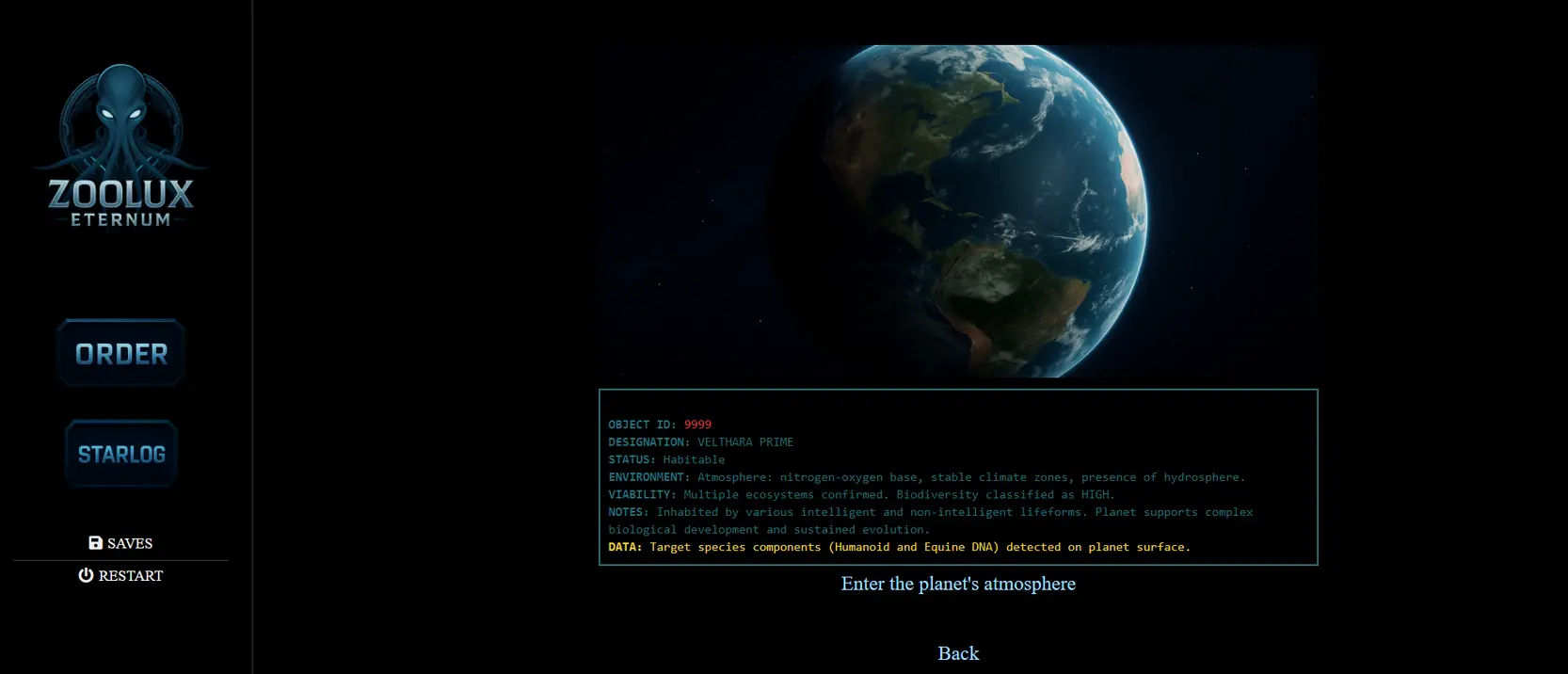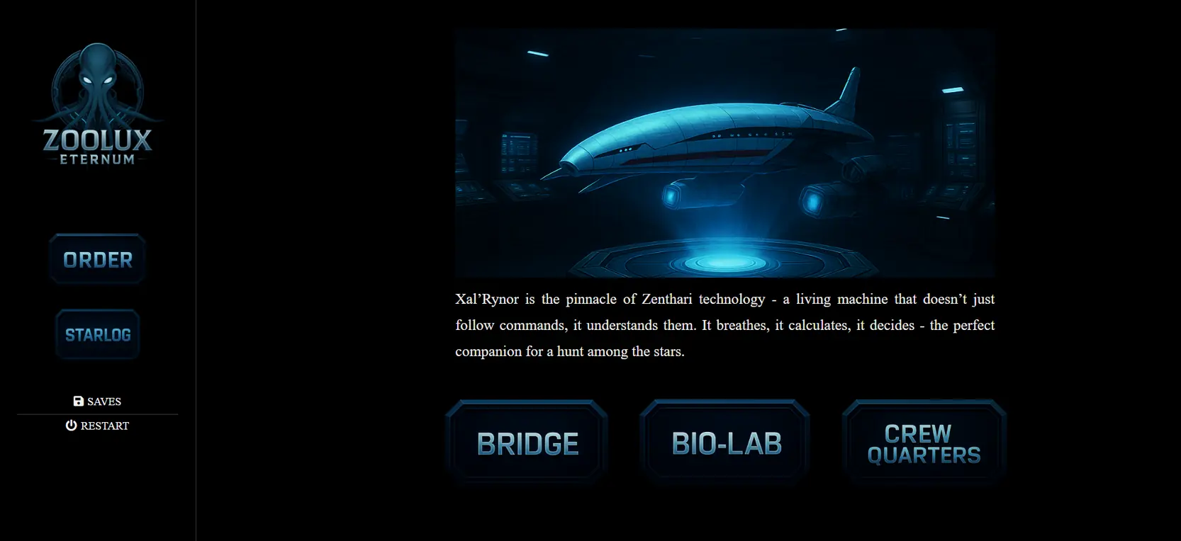 Zoolux: Eternum is a dark, story-driven, text-based sci-fi exploration game. You play as Auren Thal, a collector working for the interstellar corporation Zoolithic Exchange, tasked with capturing exotic lifeforms for galactic zoos and research labs. On your journey, you’ll explore alien worlds, gather strange creatures, and uncover disturbing secrets buried deep within forgotten star systems.